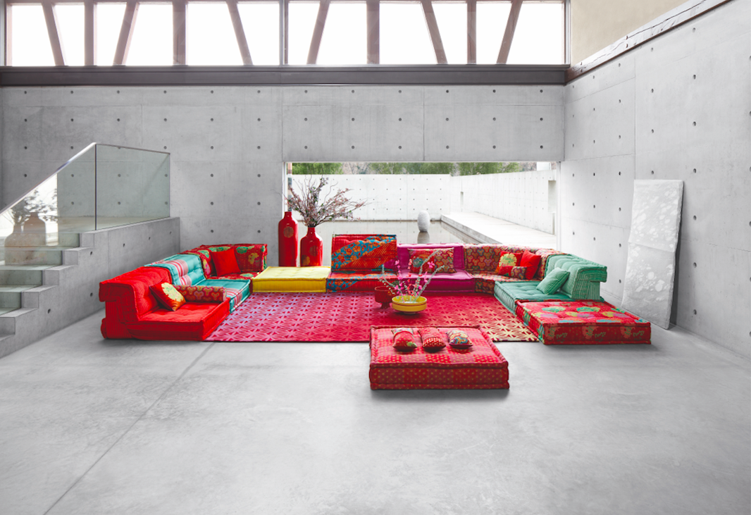 Kenzo Tagada ließ sich für das Design der Stoffe der Möbel, eingekleidet wurde das legendäre Sofa „Mah Jong“, von den Mustern alter Kimonos inspirieren.
