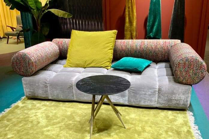 So einheitlich die Materialien im Polstermöbelbereich letztes Jahr waren, so wild wird dieses Jahr gemixt. Grobe Materialien werden mit kuschelweichem Gewebe kombiniert. Bouclé mit Glattleder, Cord mit Metall, Samt mit Rauleder. Die Sehnsucht nach Haptik wird auch dieses Jahr mit unterschiedlichen Oberflächen gestillt. Vermehrt zu sehen waren Stoffarten wie Cord sowie gaufriertes Gewebe bei Sitzmöbel und Kissen.