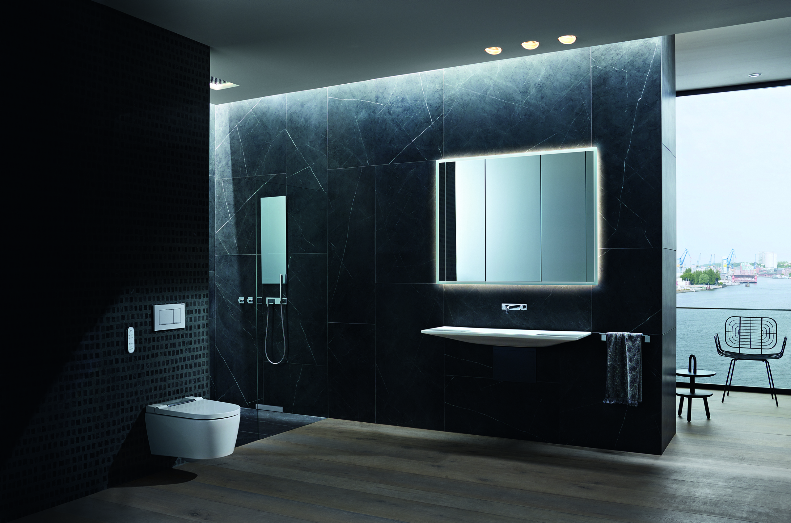 Grundsätzlich gilt: Je aufgeräumter ein Raum ist, desto größer wirkt er“, erklärt Guido Salentinig, Geschäftsführer der Geberit Vertriebsgesellschaft. „Wir nützen den Raum hinter der Wand. Zuerst haben wir den Spülkasten in der Wand verschwinden lassen, nun verstecken wir auch Siphons oder Befestigungen, die optisch störend sind, darin. Das Bad wirkt ruhiger, großzügiger.“ Die Serie ONE des Herstellers setzt deshalb auf vollintegrierte Lösungen – sogar der Spiegelschrank kann komplett in die Wand eingelassen werden, Stauraum verschwindet hinter einer eleganten Spiegelfläche.