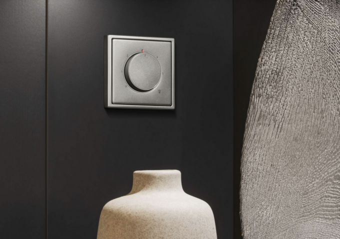 Das Design der Abdeckungen von JUNG Drehdimmern und Raumthermostaten wurde einem Upgrade unterzogen: Der Drehknopf aller Produkte misst nun einheitlich 42 mm Durchmesser. Mit reduzierter Höhe wirkt er eleganter. Auch in den Schalterprogrammen aus Echtmetall ist die Vorderseite des Drehknopfs nun aus demselben Material gefertigt. Für einheitliche Eleganz.