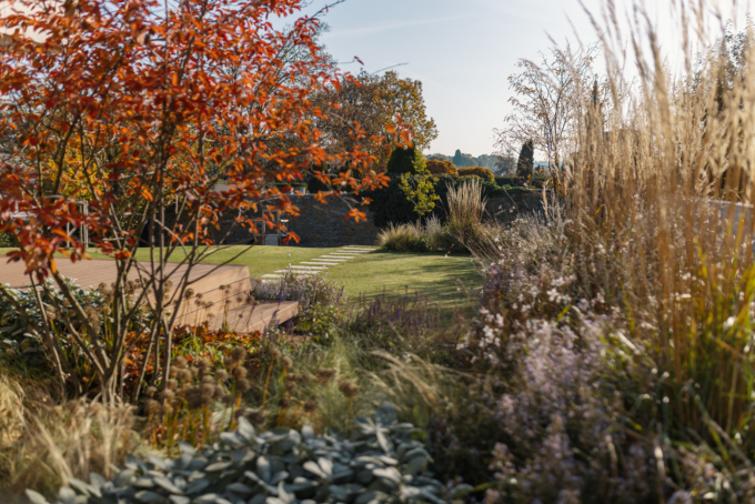 Filigrane Reitgräser, üppiger Salbei und zarte Federhaargräser bringen das mehrstämmige Gehölz perfekt zur Geltung. Warmes Herbstlicht umspielt die Bepflanzung mit vielfältigen Kontrasten.